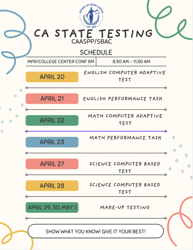 Las pruebas SBAC se realizarán la próxima semana, ¡y es hora de prepararse para demostrar lo que saben! Esta es su oportunidad para demostrar todo el esfuerzo y el aprendizaje que han logrado este año.