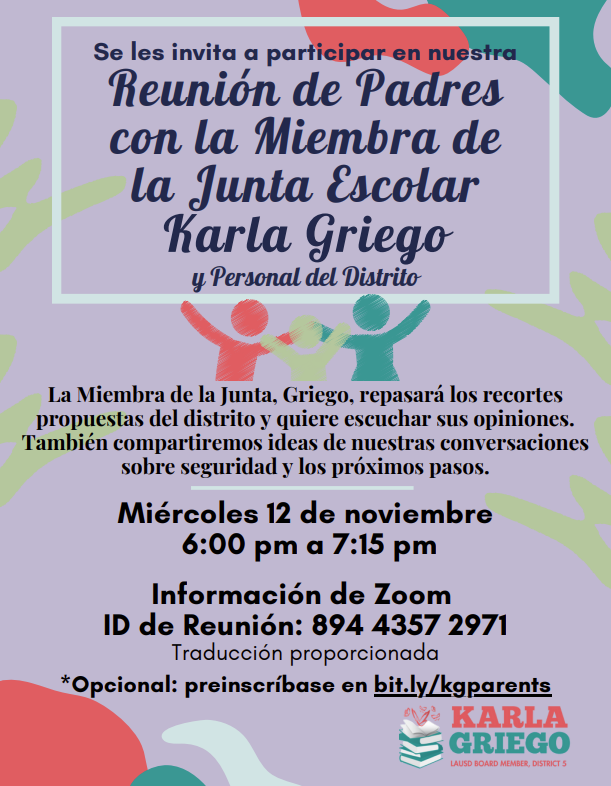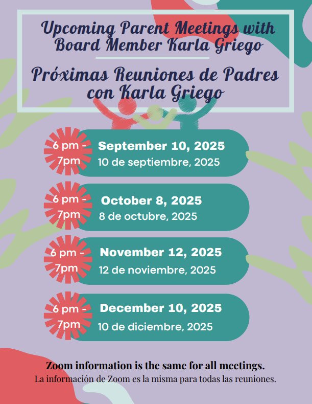 Parent Meetings with Board Member Karla Griego/ Reuniones de padres con la miembro de la junta directiva Karla Griego Attached Files Parent Meetings with Board Member Karla Griego.pdf
